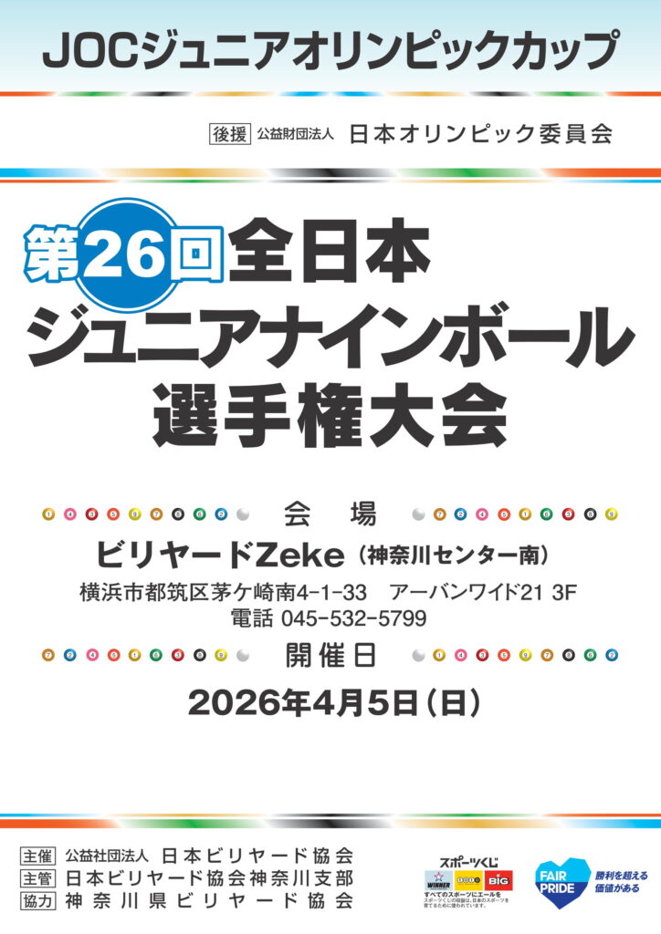 第26回 全日本ジュニア9ボール:要項【関東予選&ガールズ&本戦】 お知らせ 2025.12.21 全日本ジュニア9ボール選手権大会の詳しい情報はこちらから ※参加資格にご留意ください ※関東地区代表決定戦のエントリーはNBA神奈川支部までお願いいたします